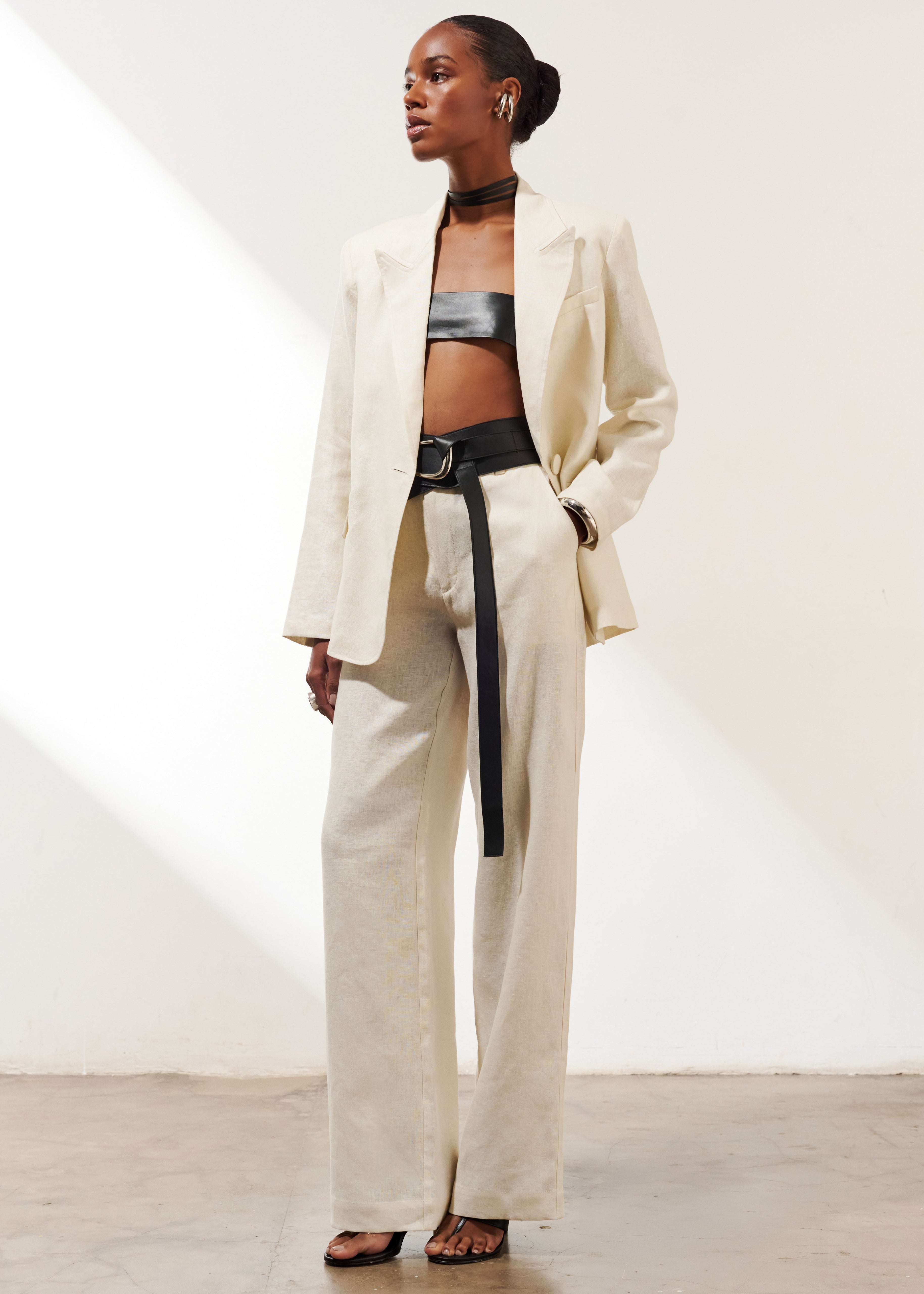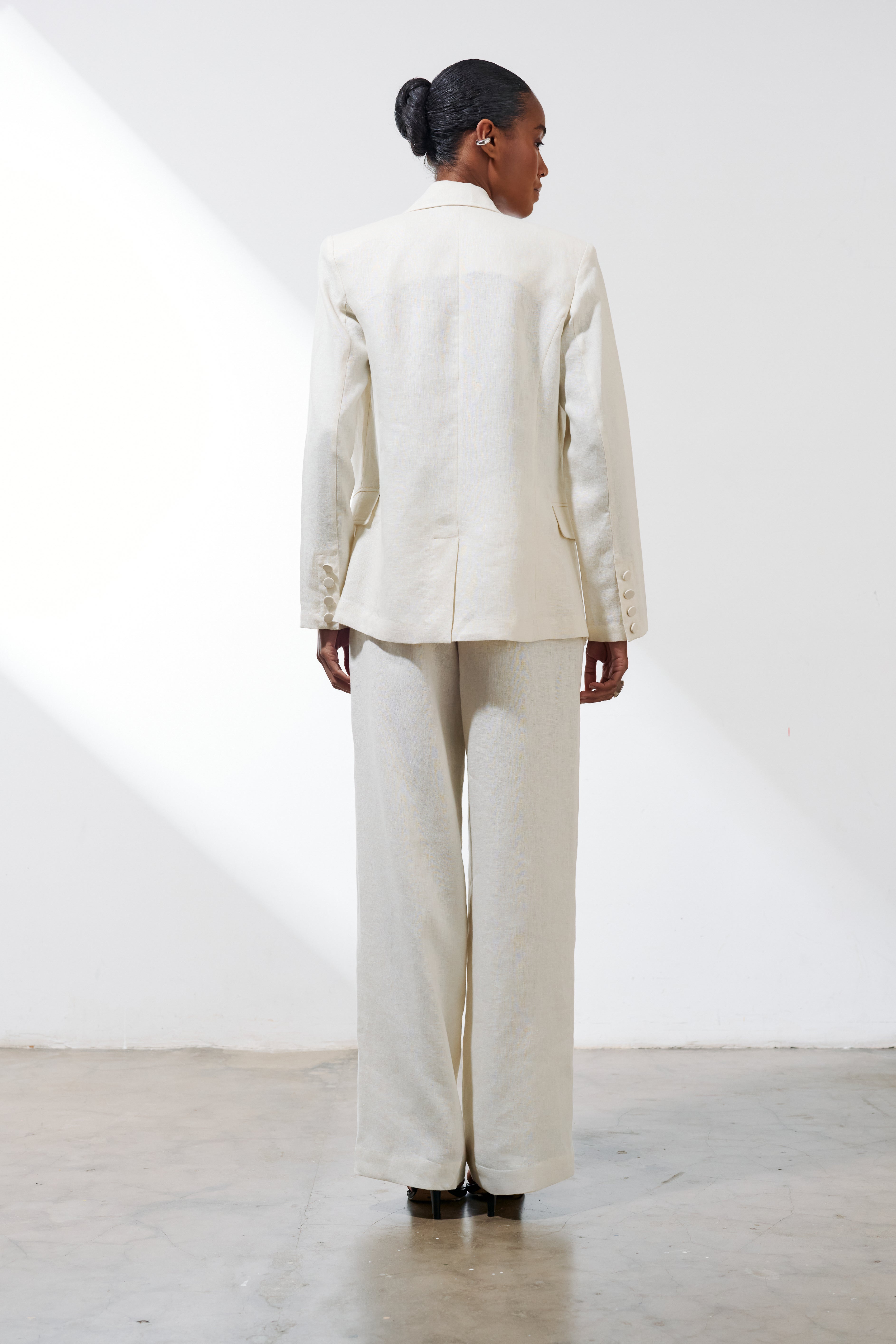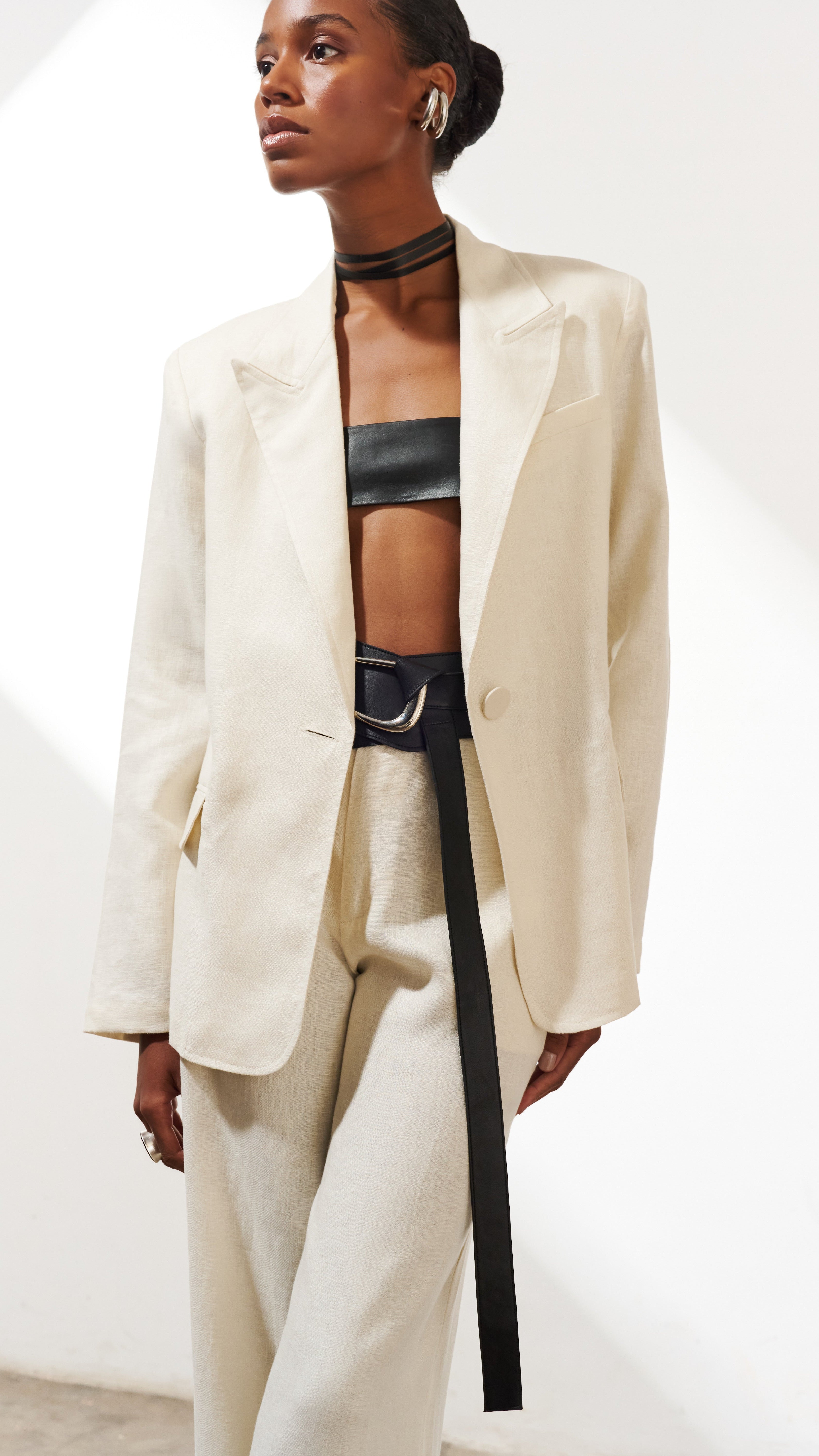Com estrutura clássica e caimento impecável, ele apresenta ombros levemente marcados, lapelas alongadas e fechamento frontal com botão único, conferindo um ar minimalista.
