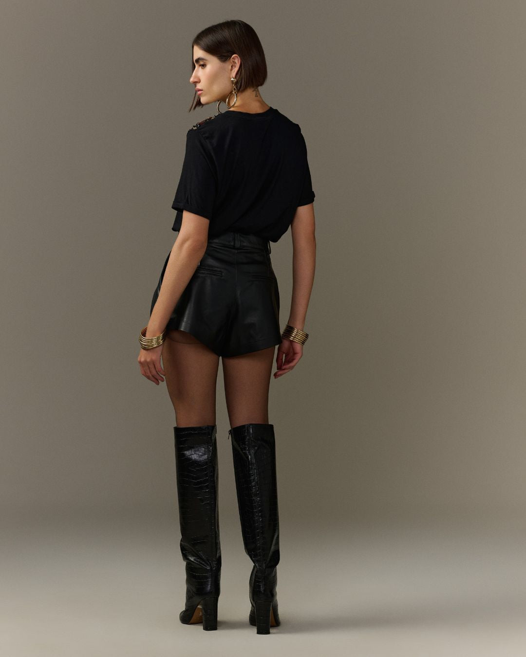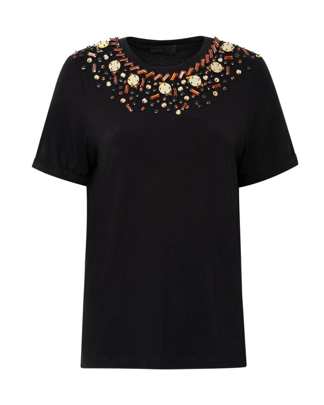 BLUSA EM MALHA, MODELAGEM RETA, COM DECOTE REDONDO E MANGAS CURTAS. DETALHE DE BORDADO APLICADO NO DECOTE COM PEDRARIAS E METAIS DECORATIVOS EM MIX DE TAMANHOS E CORES.
