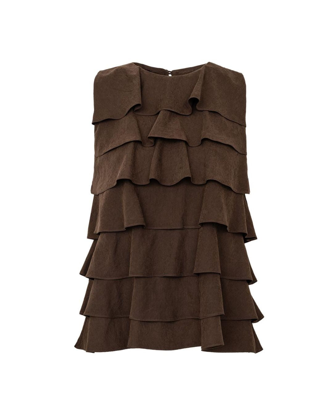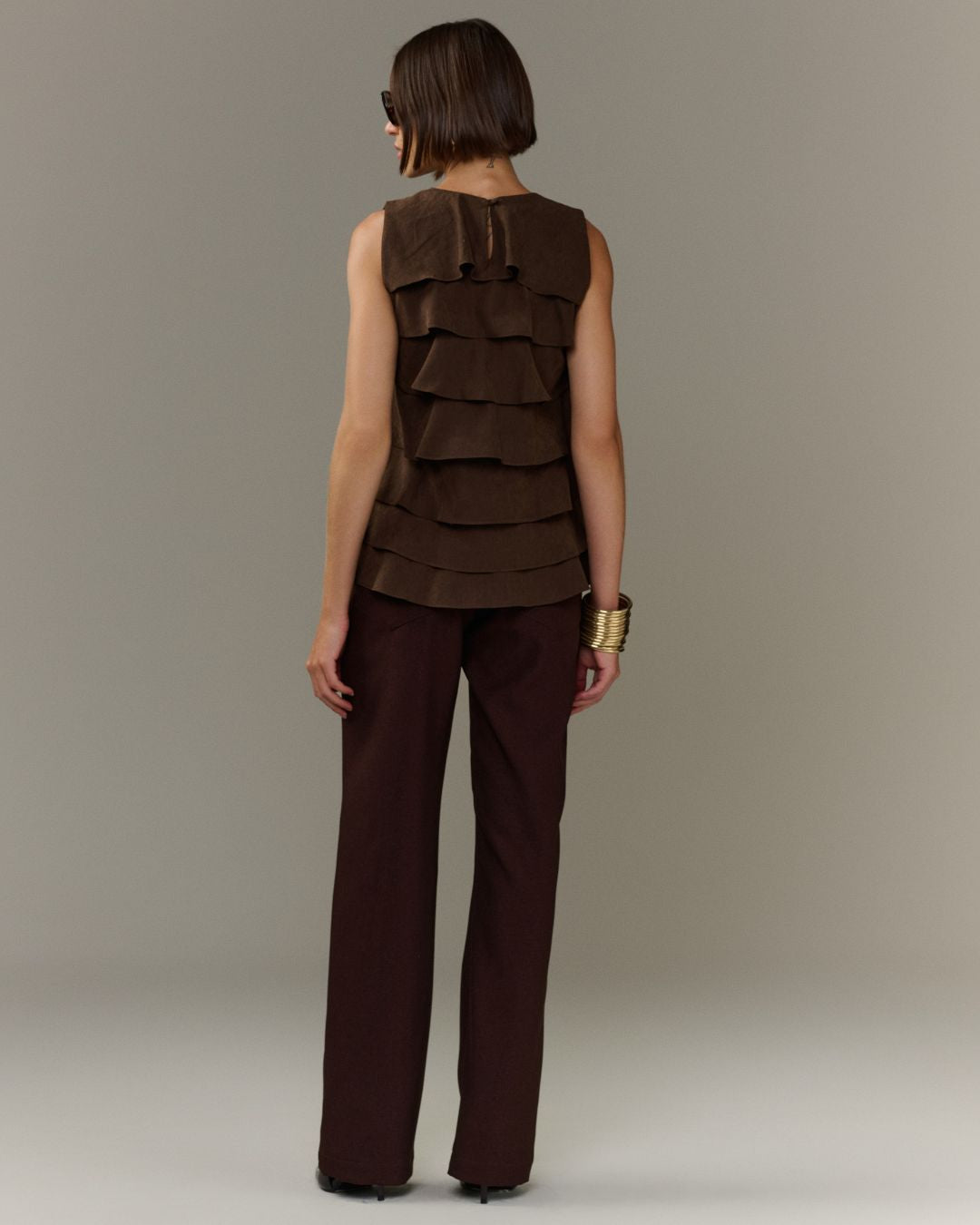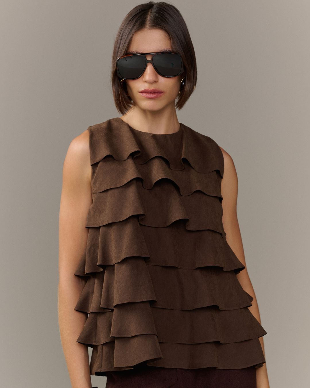 Blusa em cupro com modelagem regata, com babados anatômicos em toda a peça. Fechamento com botão na gola.