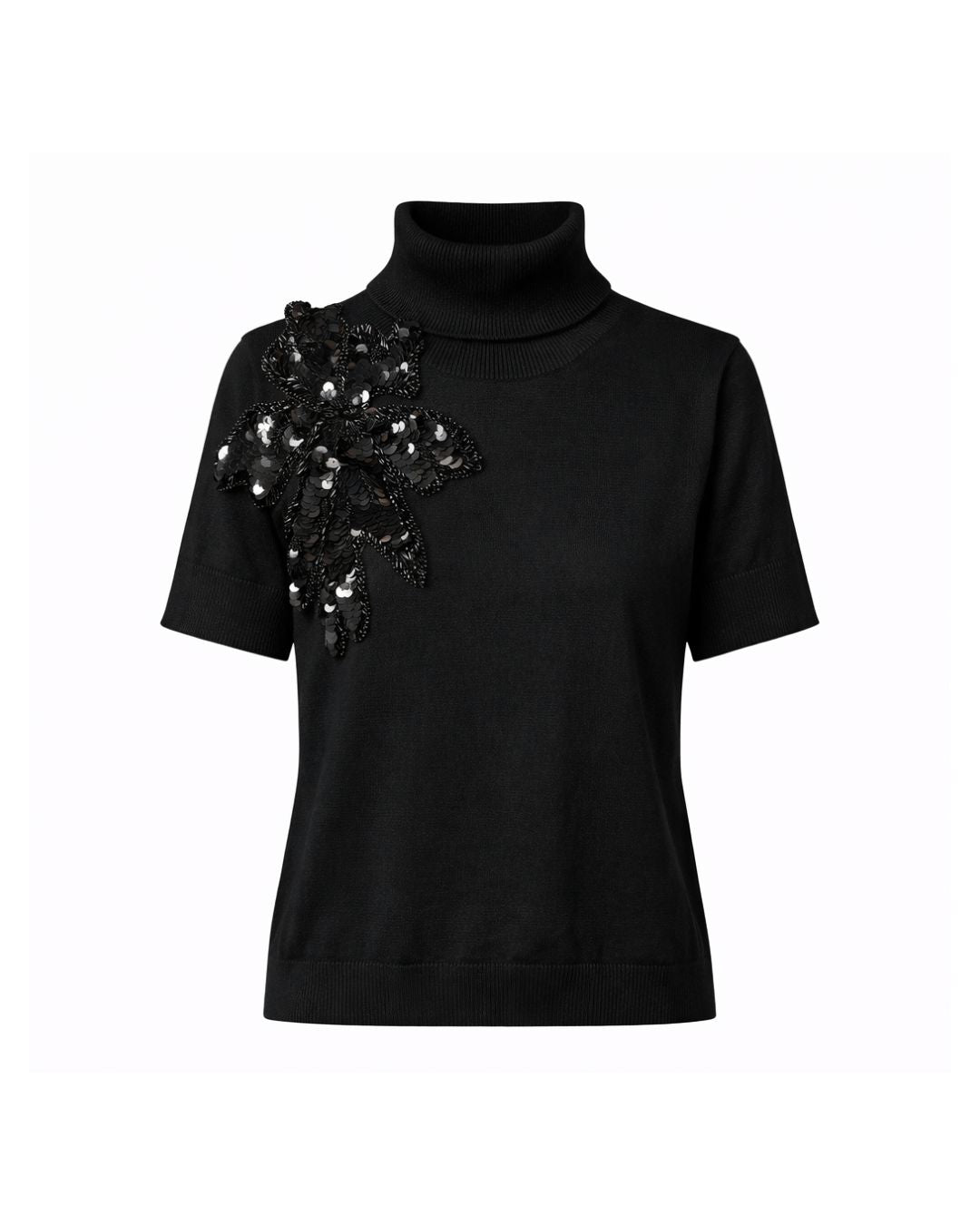 Blusa manga curta em tricot com gola alta, aplicação de lantejoulas formando uma flor no ombro direito.