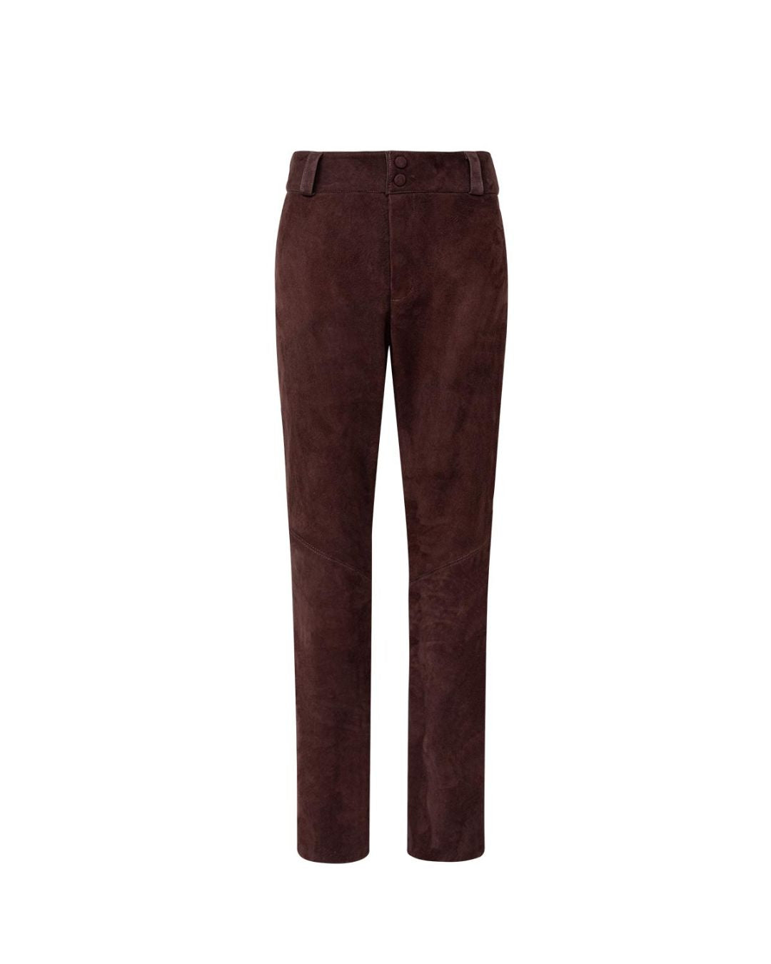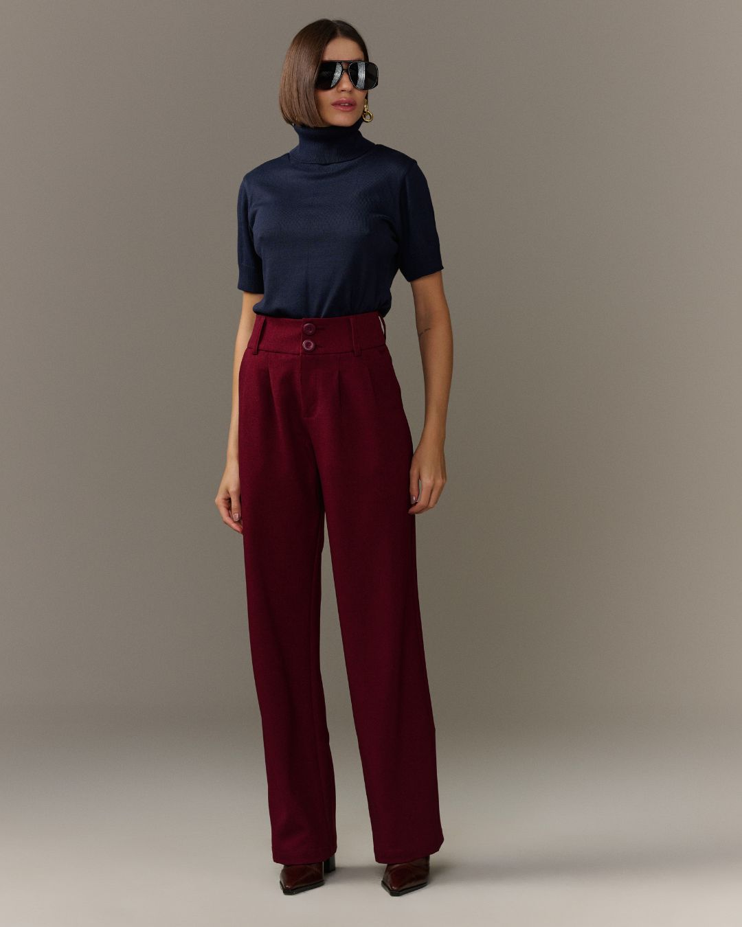 CALÇA MODELAGEM ALFAIATARIA, PREGAS FRONTAIS, BOLSO FACA E BOTÕES NA MESMA COR DO TECIDO.