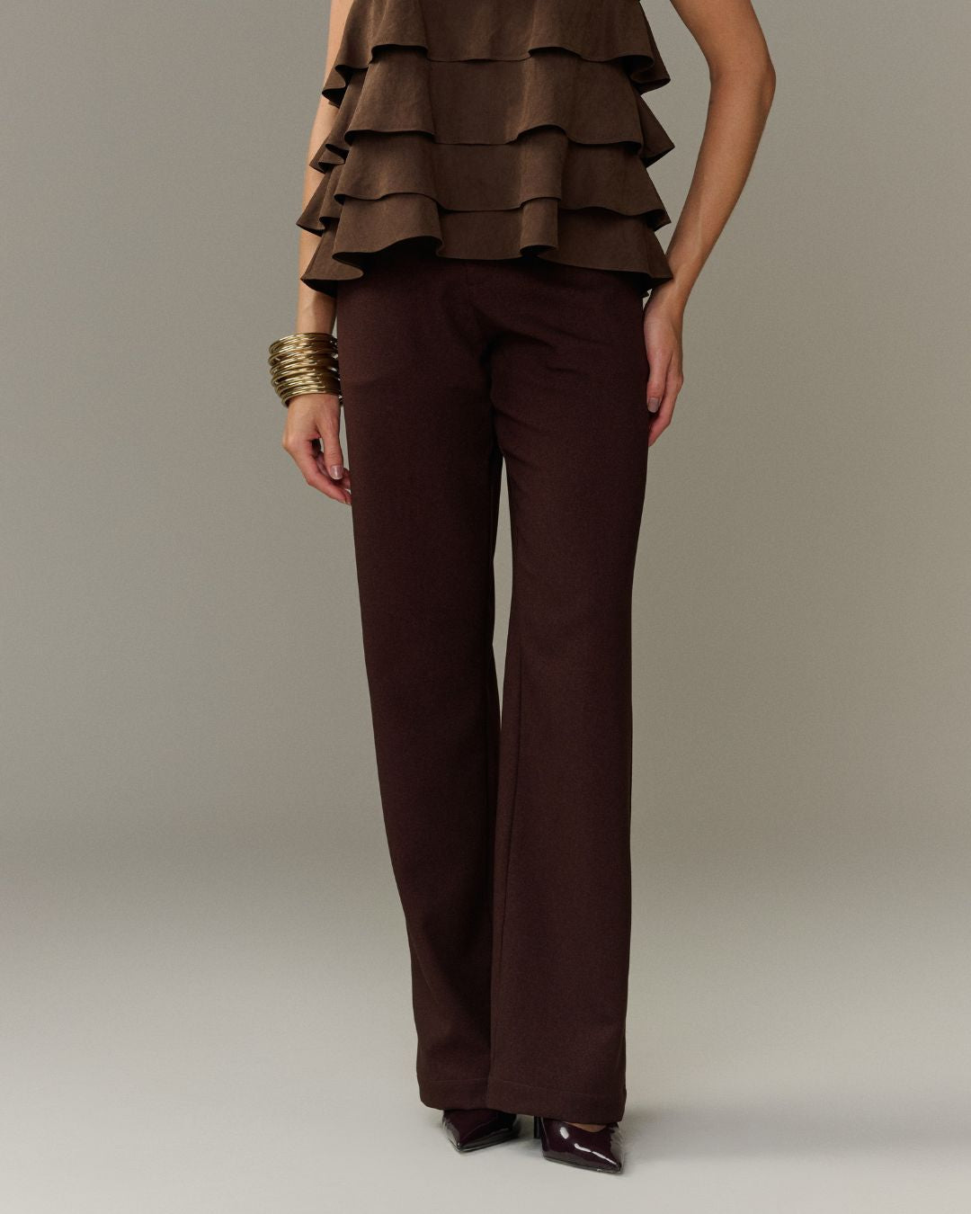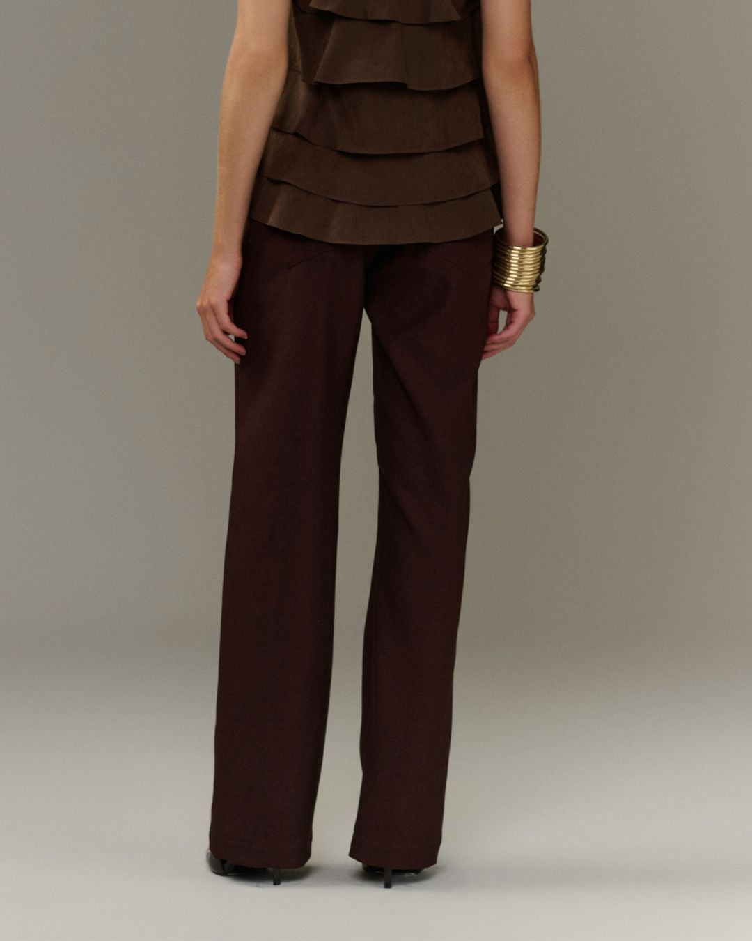 CALÇA DE LÃ BATIDA, MODELAGEM ALFAIATARIA, FECAHAMENTO BOLSO FACA E BOLSOS TRASEIROS.