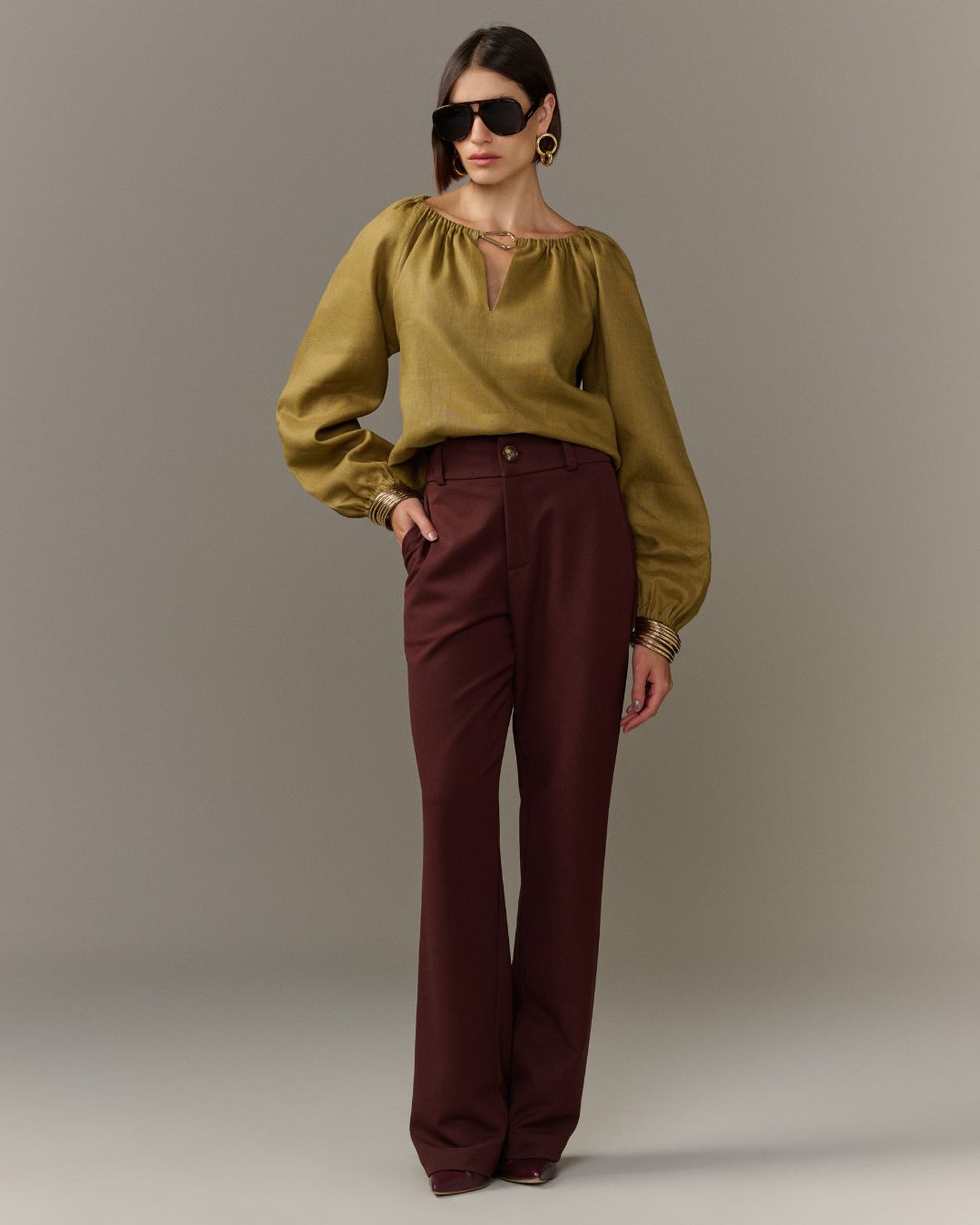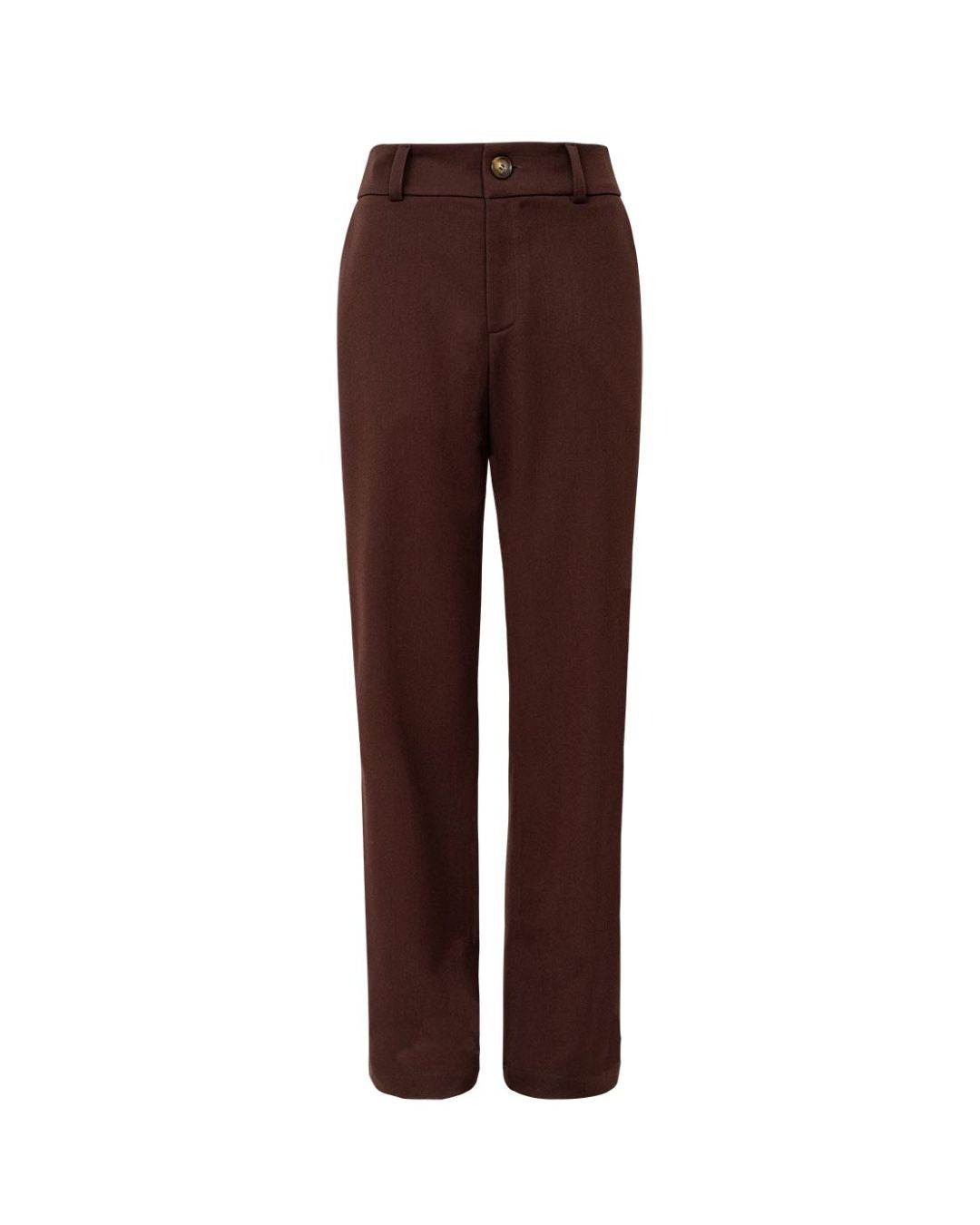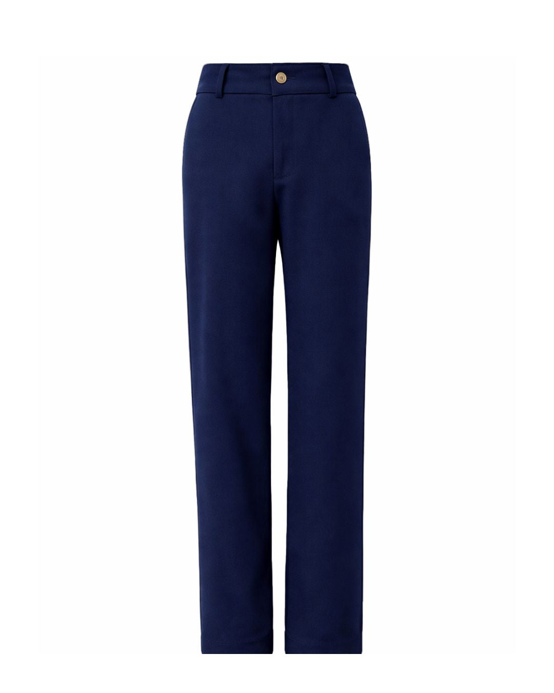 Calça com modelagem reta, fechamento frontal com zíper e botões, bolsos faca laterais.