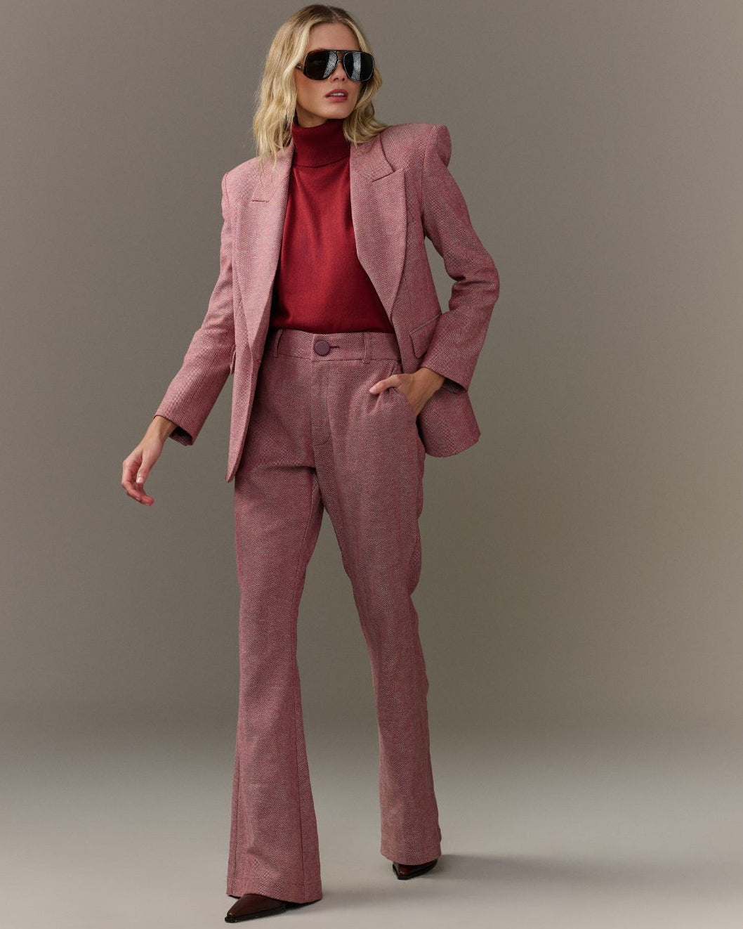 Calça confeccionada em tecido com padronagem chevron, que adiciona sofisticação e textura ao visual. Possui cós anatômico que garante melhor ajuste ao corpo, fechamento frontal com zíper e botão forrado em couro. Conta com bolsos faca nas laterais e modelagem flare, que alonga a silhueta e valoriza a composição com elegância.