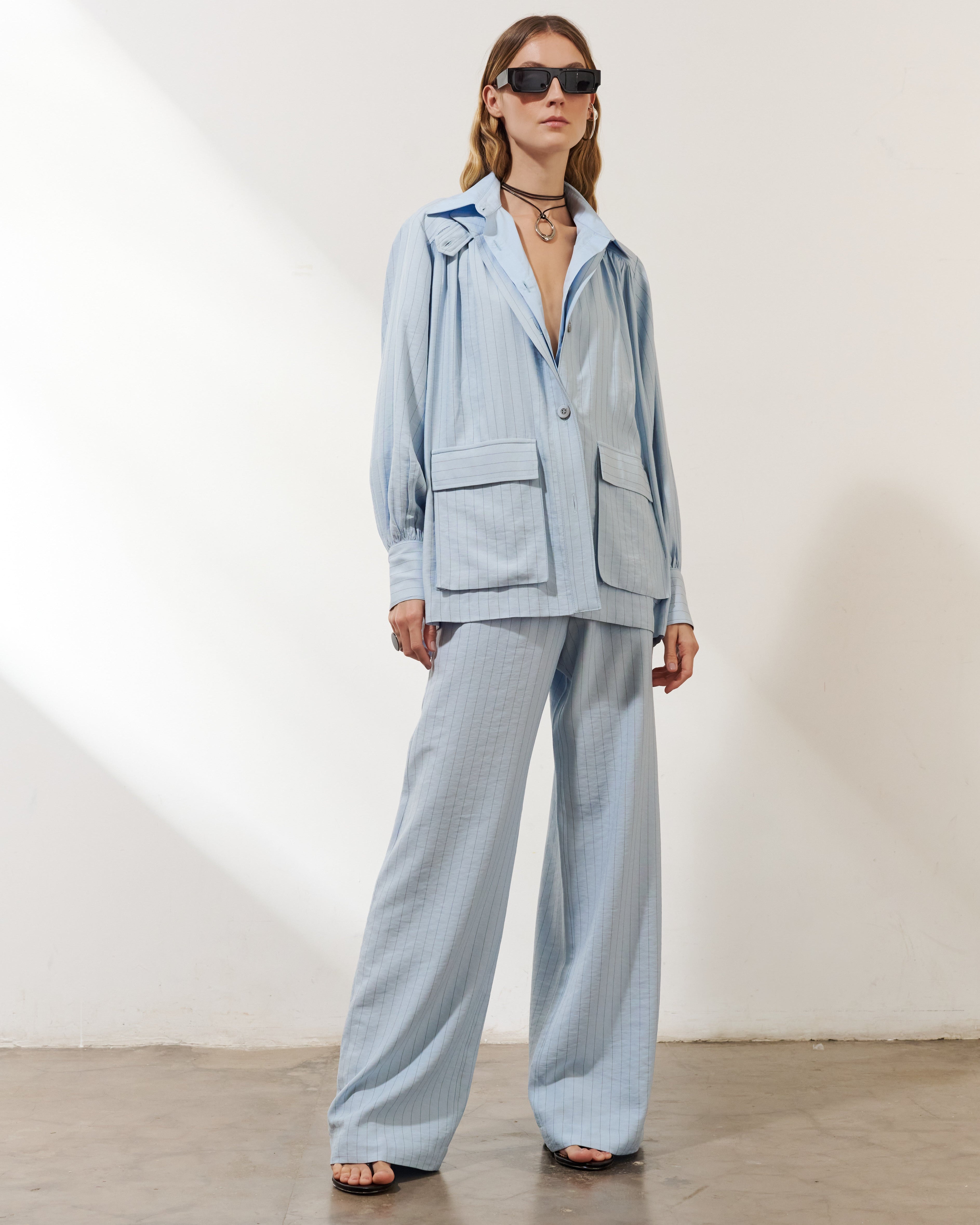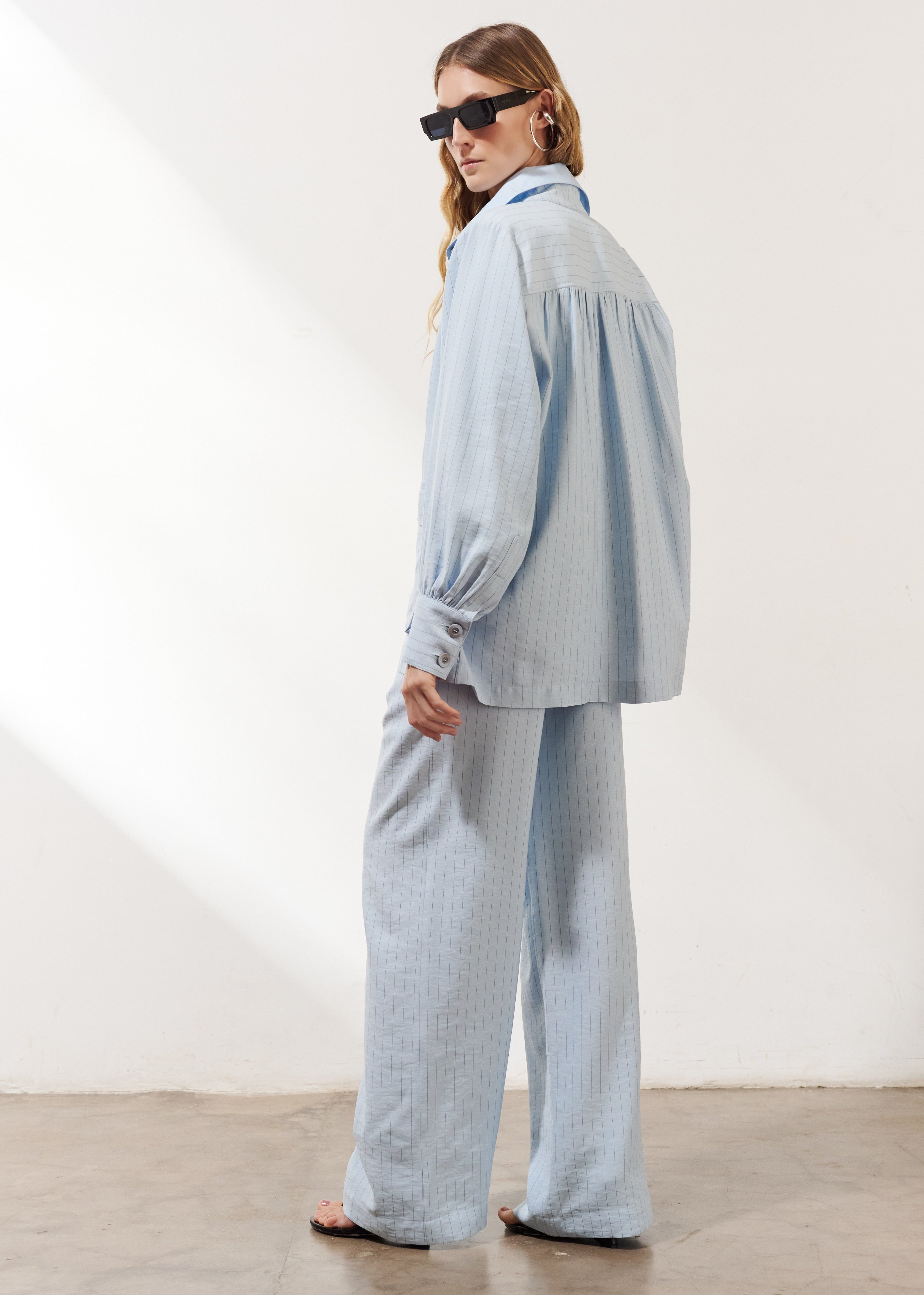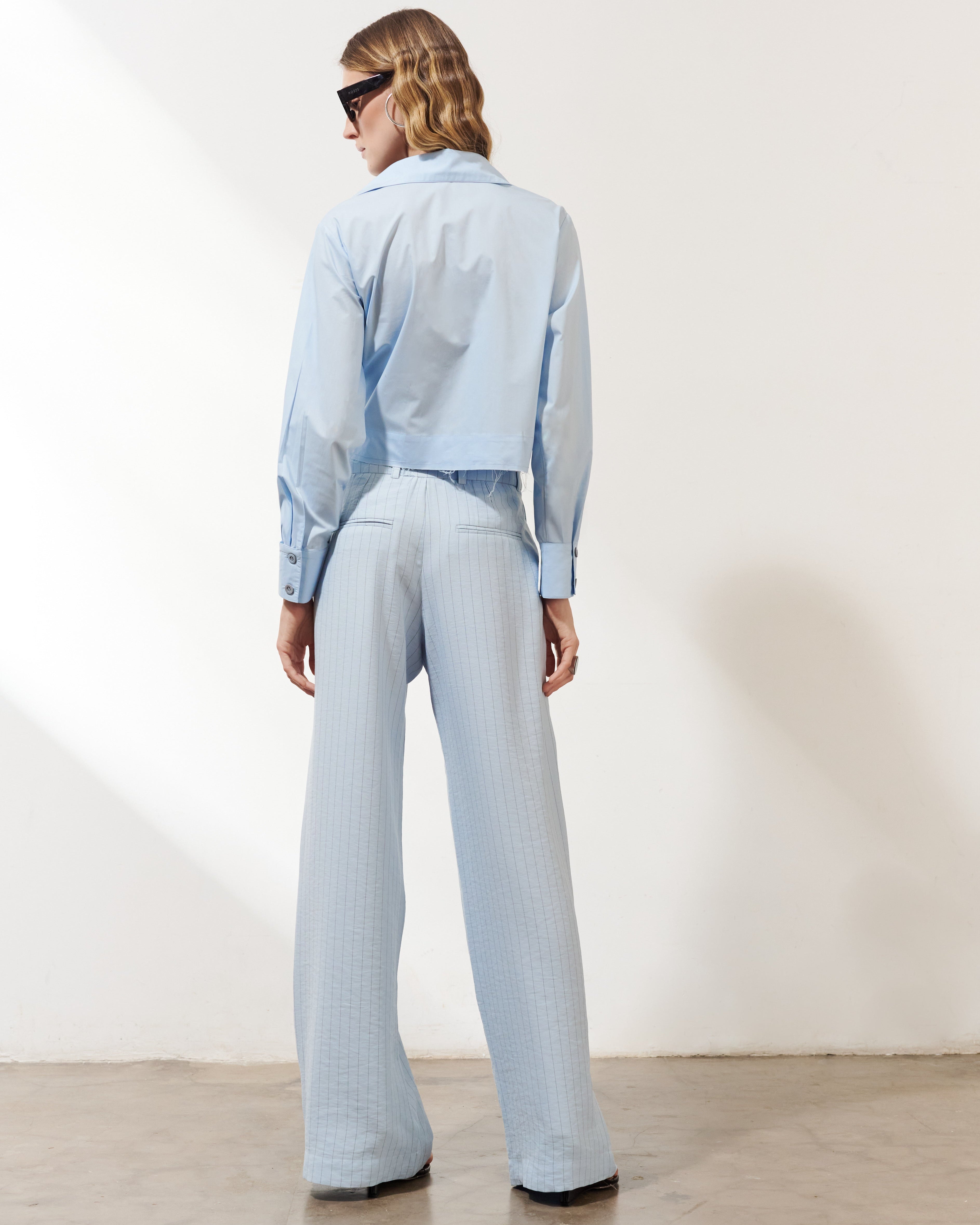 A modelagem reta com perna ampla garante movimento e suavidade, valorizando diferentes tipos de corpo. O azul claro, assinatura da linha Santorini, reforça o visual fresco e contemporâneo — perfeito para composições urbanas, viagens e ocasiões casuais elegantes.