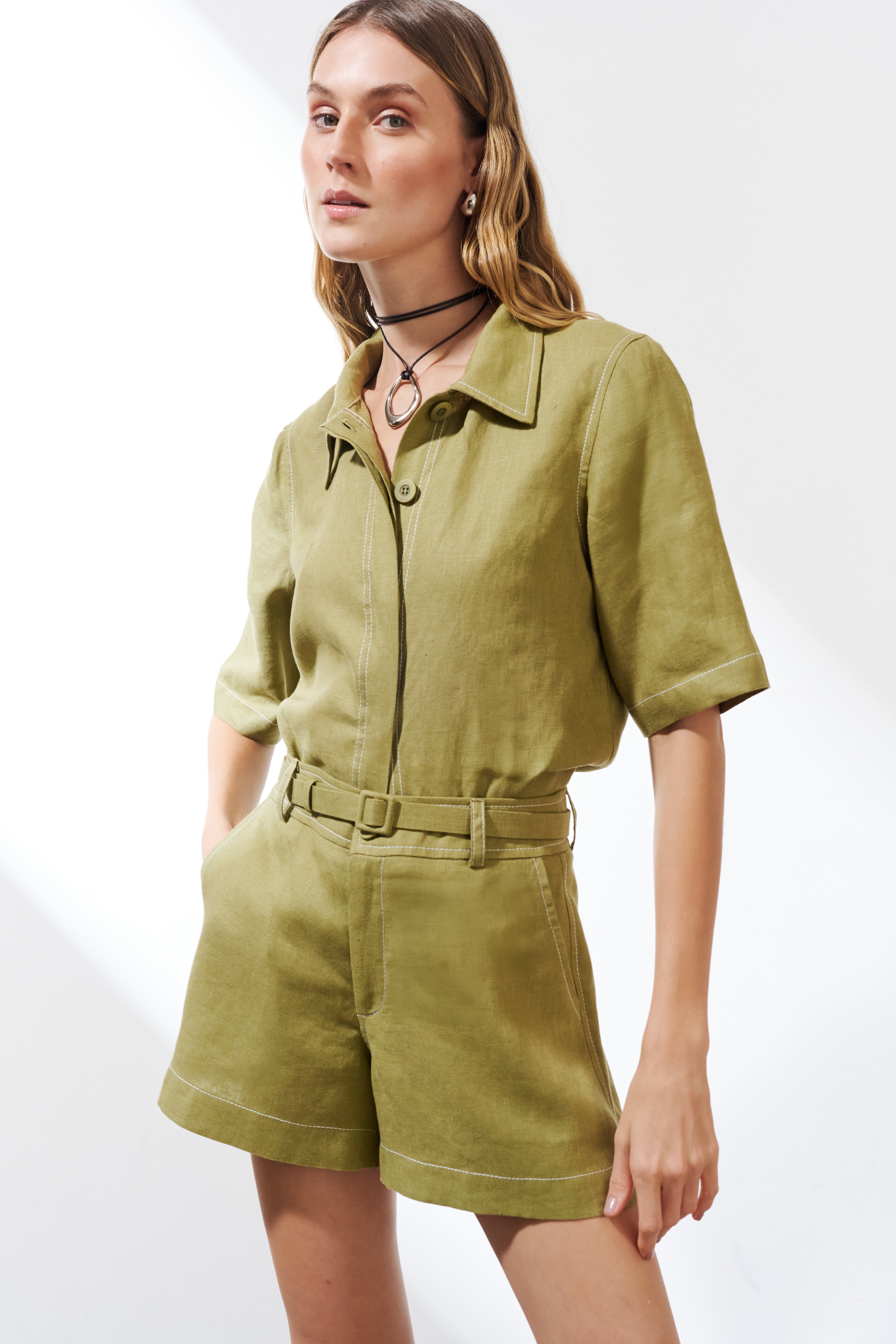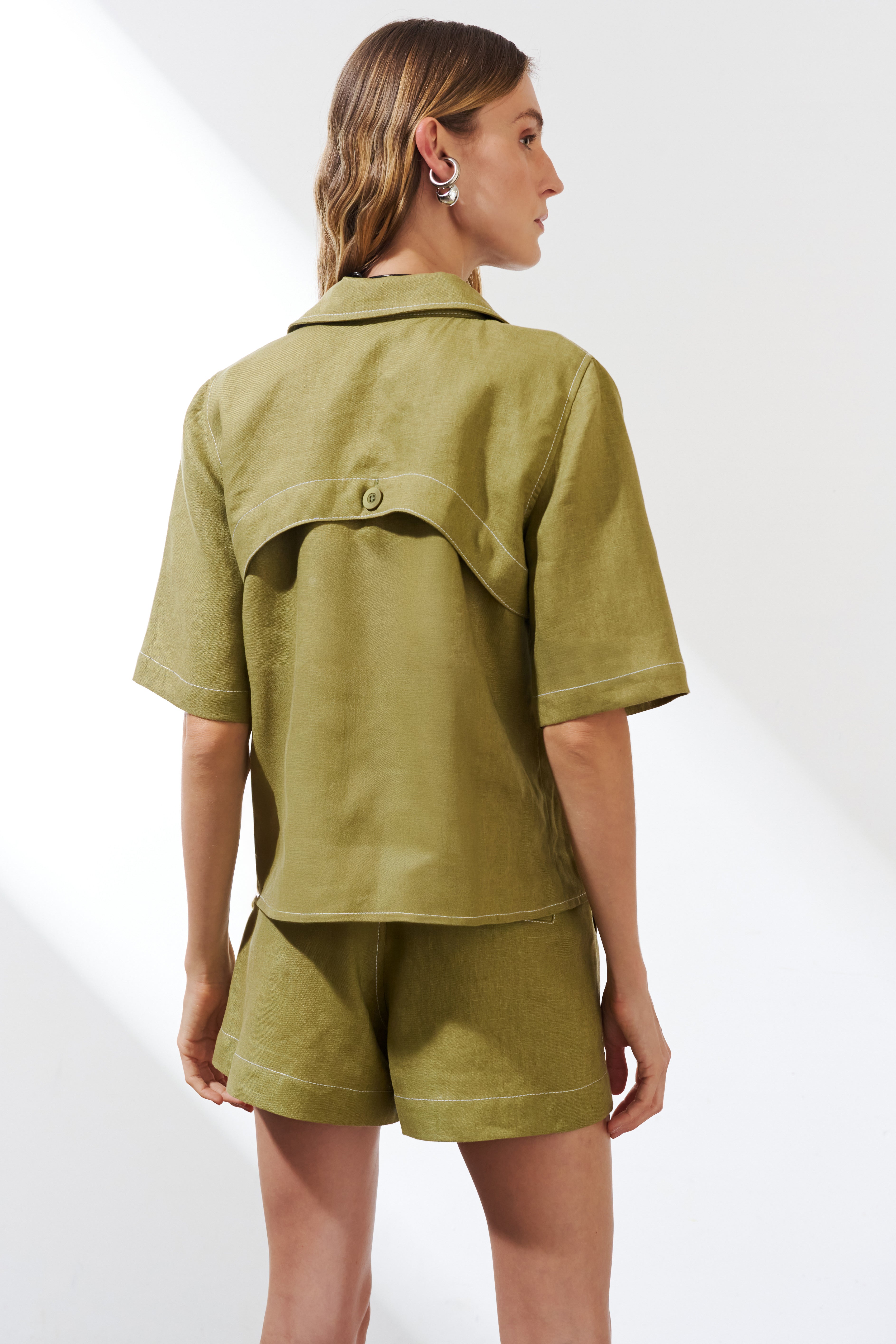 O tom verde sofisticado traz personalidade, enquanto o tecido leve proporciona conforto e respirabilidade, perfeita para dias ensolarados ou produções casuais chiques.