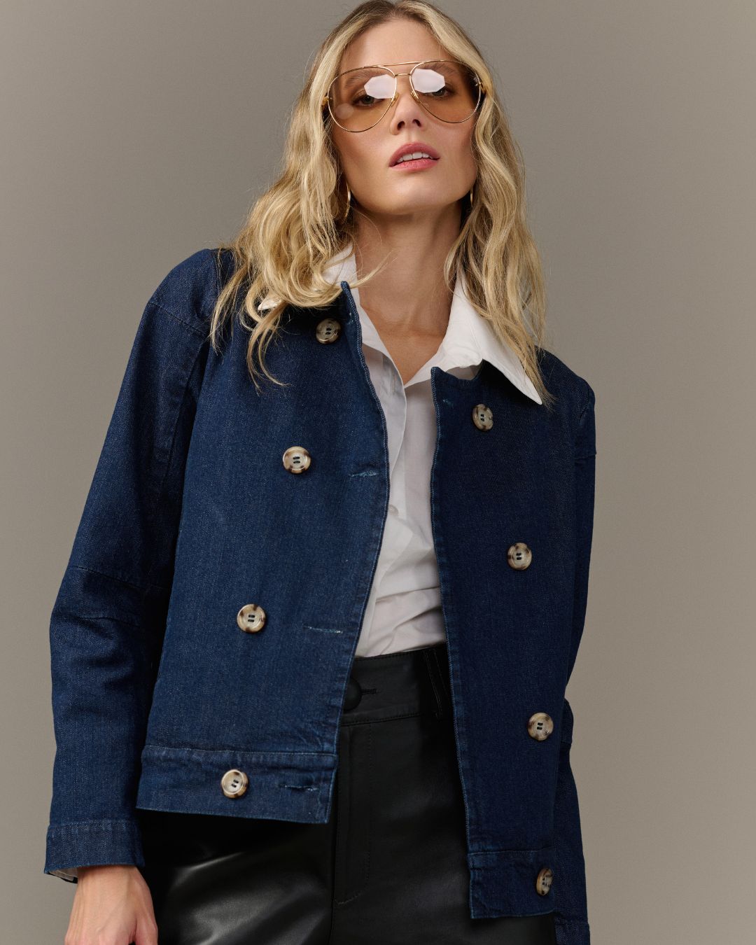 CLÁSSICA E ATEMPORAL, A JAQUETA GANHA UMA RELEITURA SOFISTICADA COM MODELAGEM ESTRUTURADA. CONFECCIONADA EM DENIM ENCORPADO, POSSUI FECHAMENTO FRONTAL POR BOTÔES EM DUPLA ABOTOAÇÃO QUE ADICIONAM PERSONALIDADE A PEÇA.