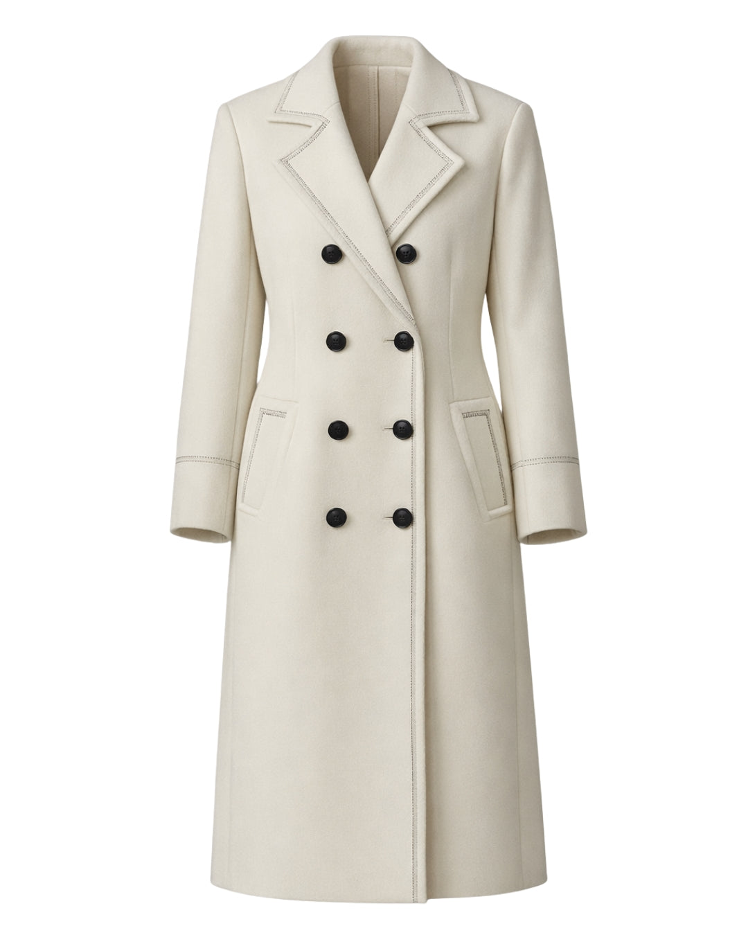O comprimento longo, as mangas longas e os bolsos laterais reforçam a funcionalidade, enquanto o fechamento frontal por botões garante um acabamento clássico e refinado.