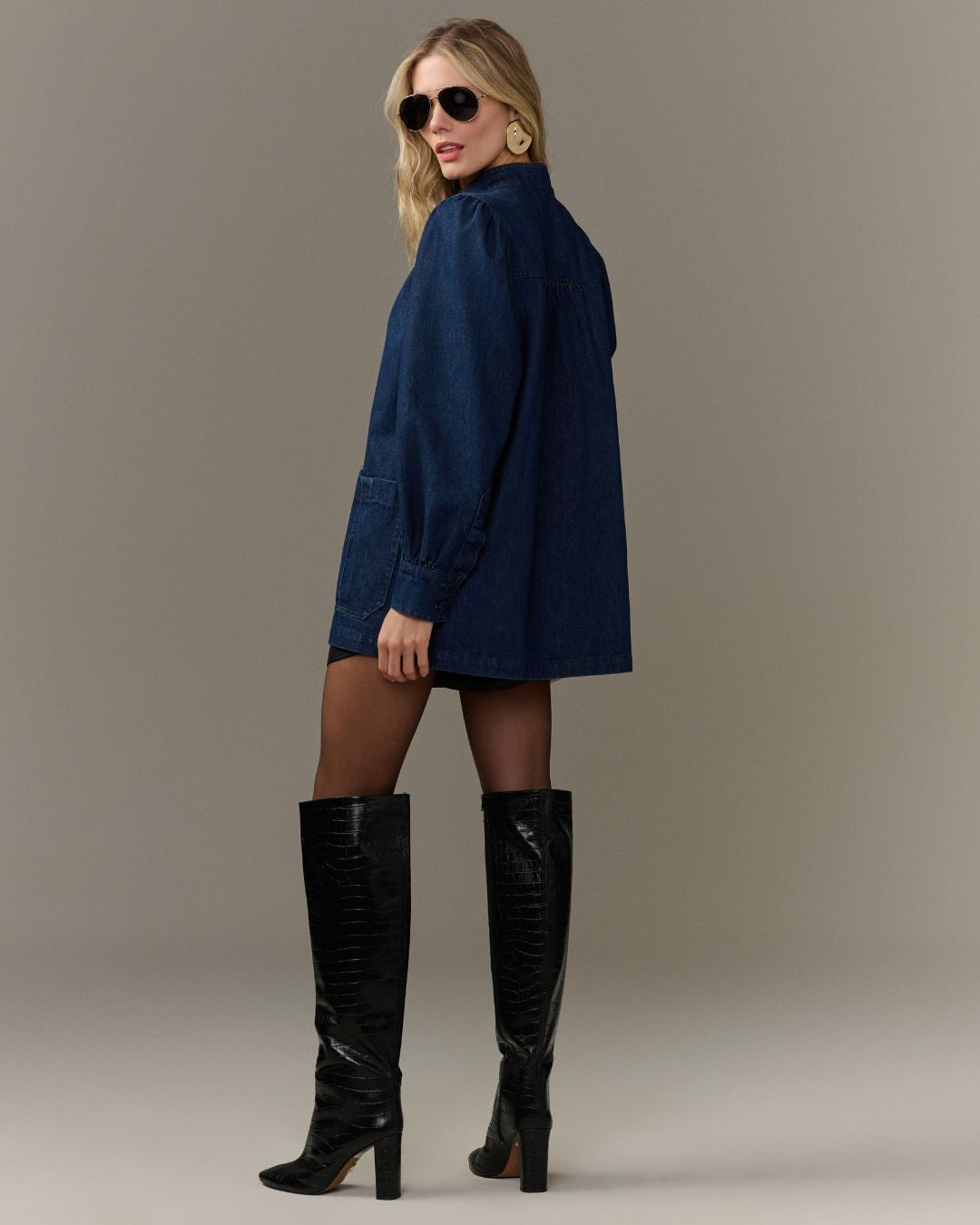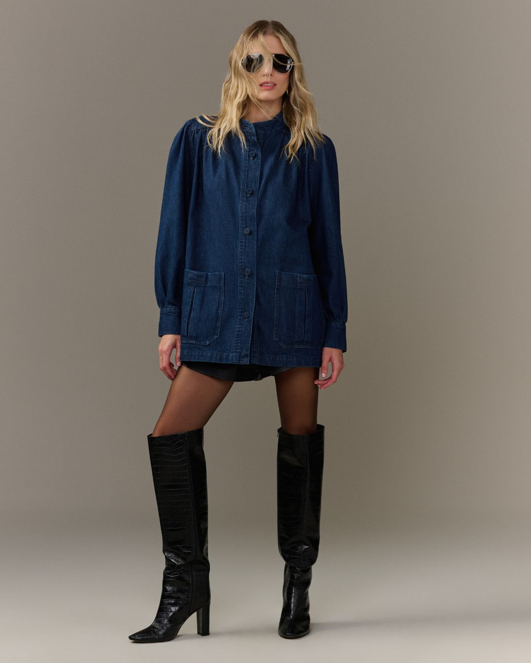 CASACO EM JEANS, MODELAGEM OVERSIZED ALONGADA, COM GOLA ALTA ESTRUTURADA, FECHAMENTO FRONTAL POR BOTÕES, MANGAS LONGAS COM PUNHOS AJUSTADOS E RECORTE COM LEVE FRANZIDO NOS OMBROS.