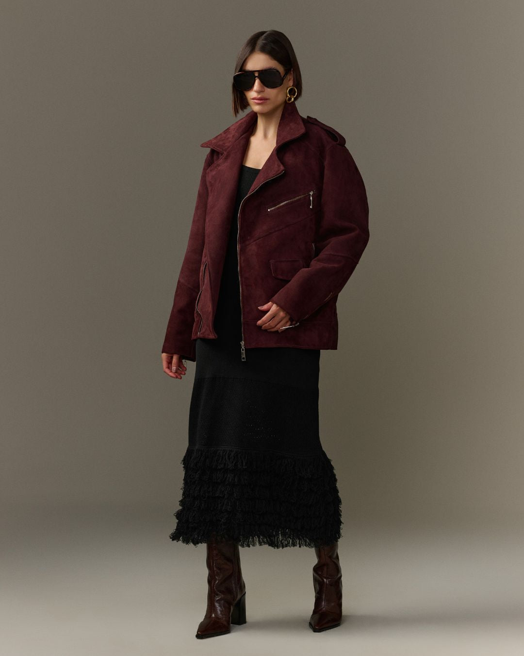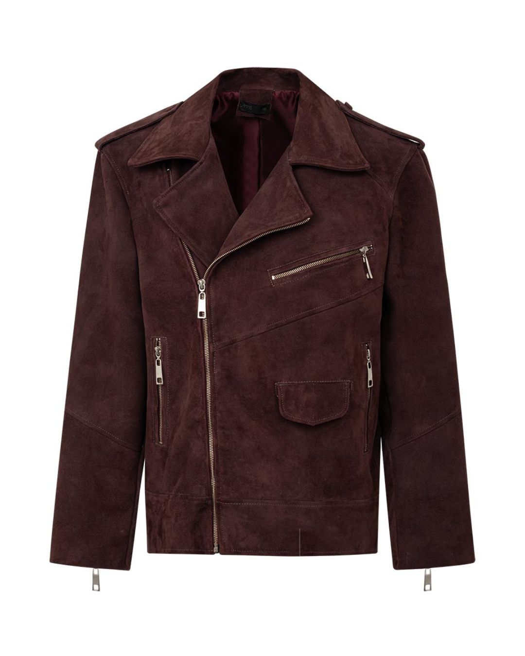 Jaqueta em chamois, modelagem over, detalhes em zíper metalizado. Fechamento frontal com zíper e lapela.