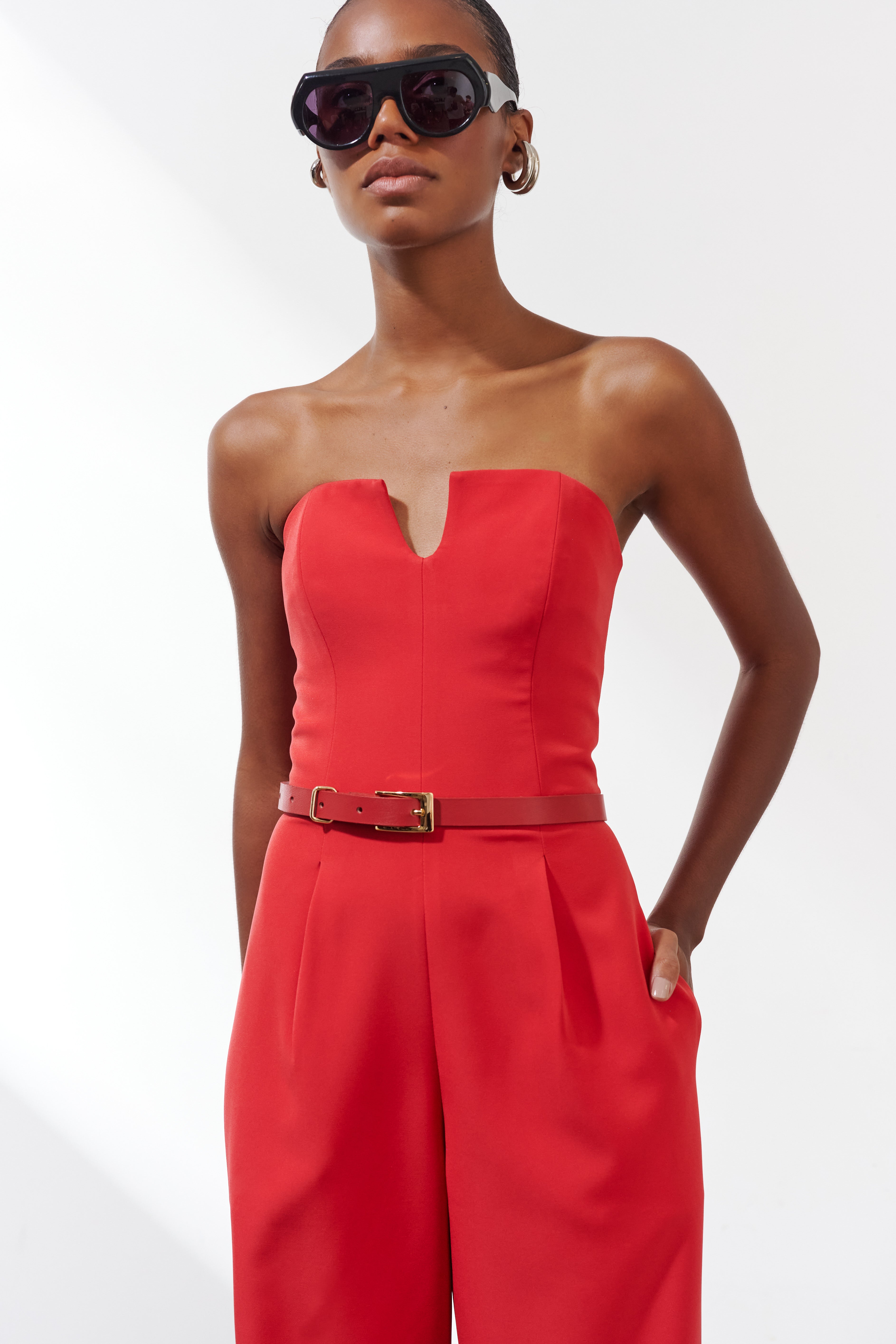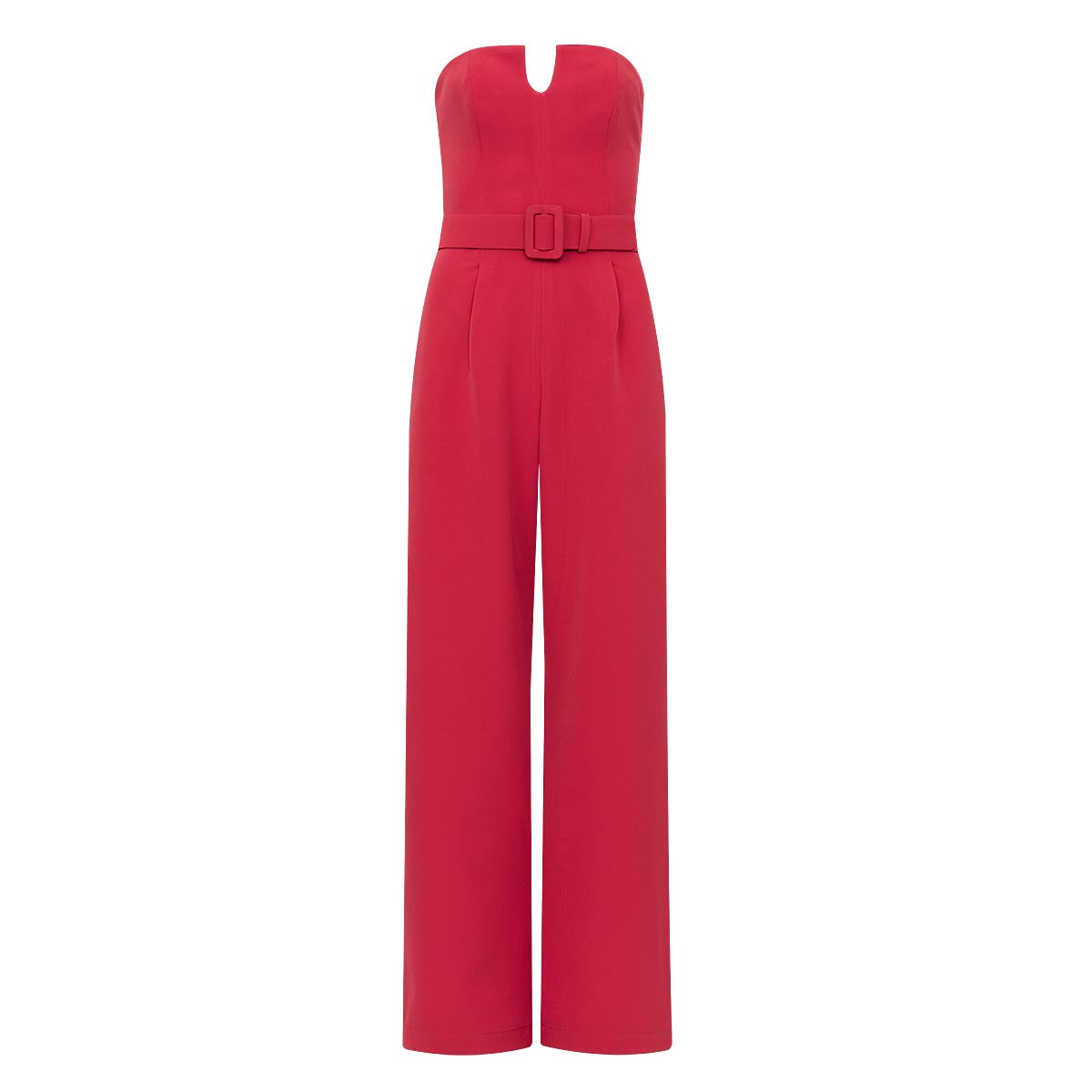 • Macacão strapless em crepe patou estruturado;