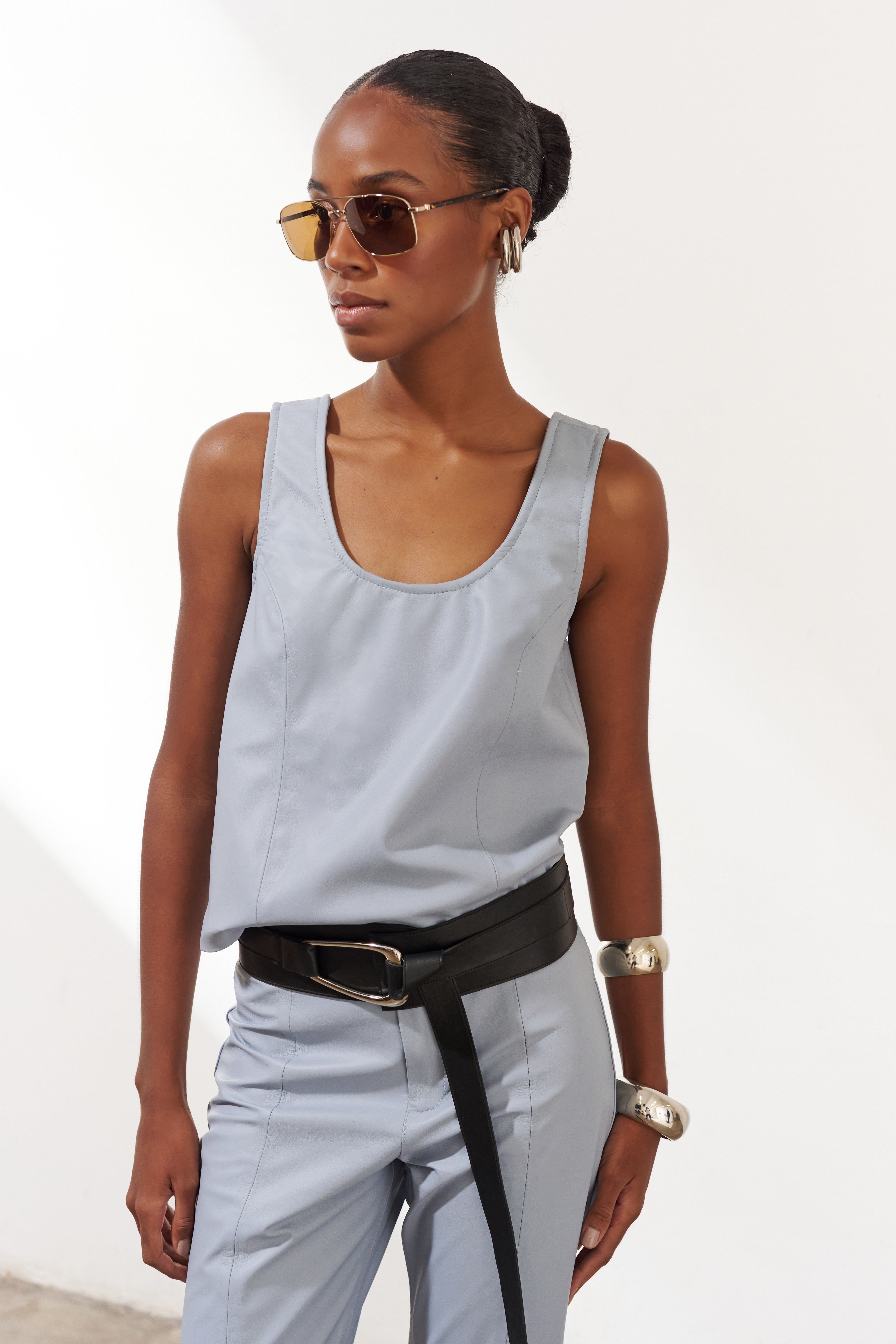 Minimalista e atemporal, esta regata em couro legítimo aposta em linhas retas.