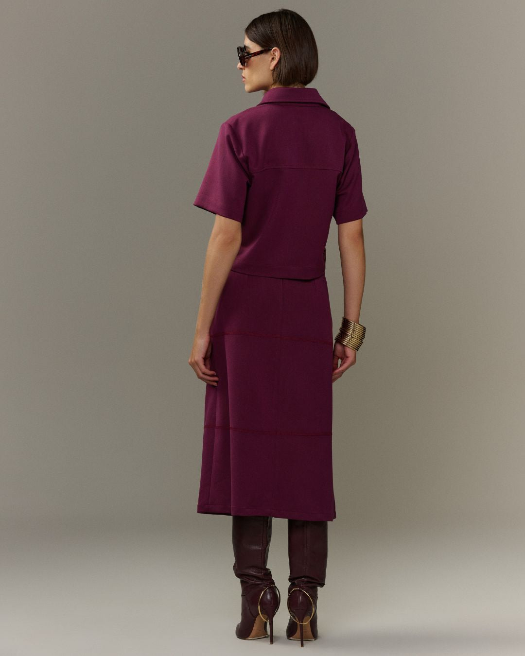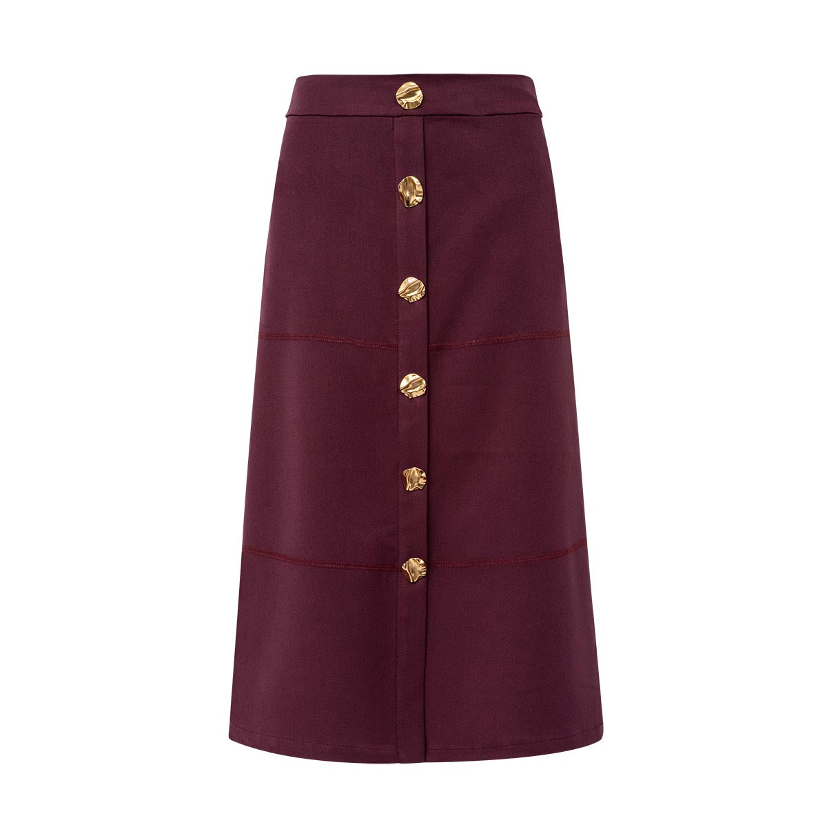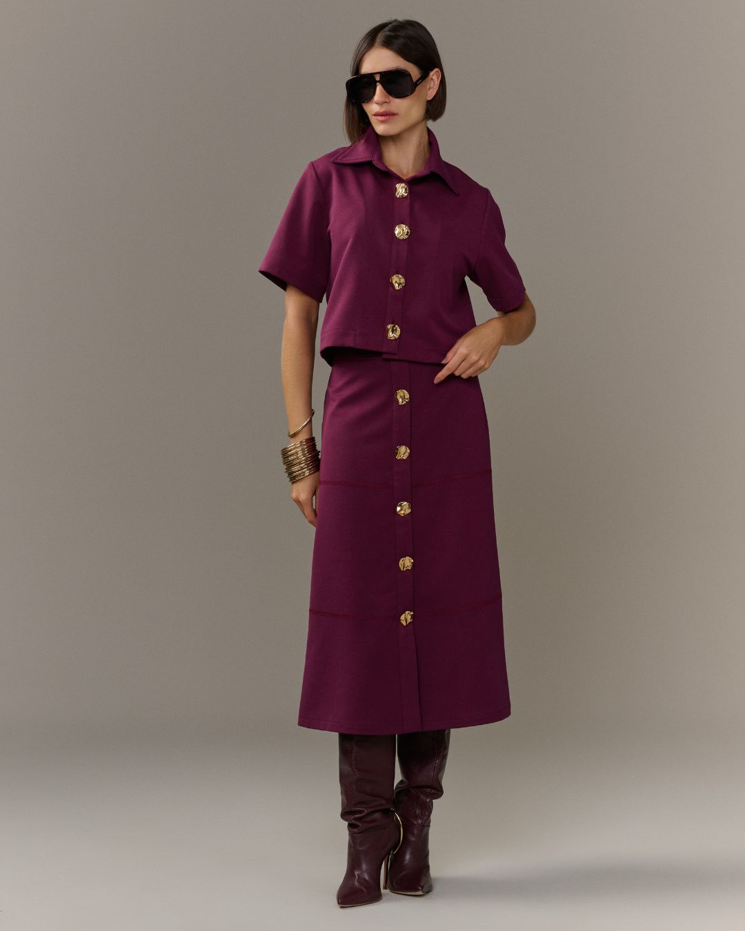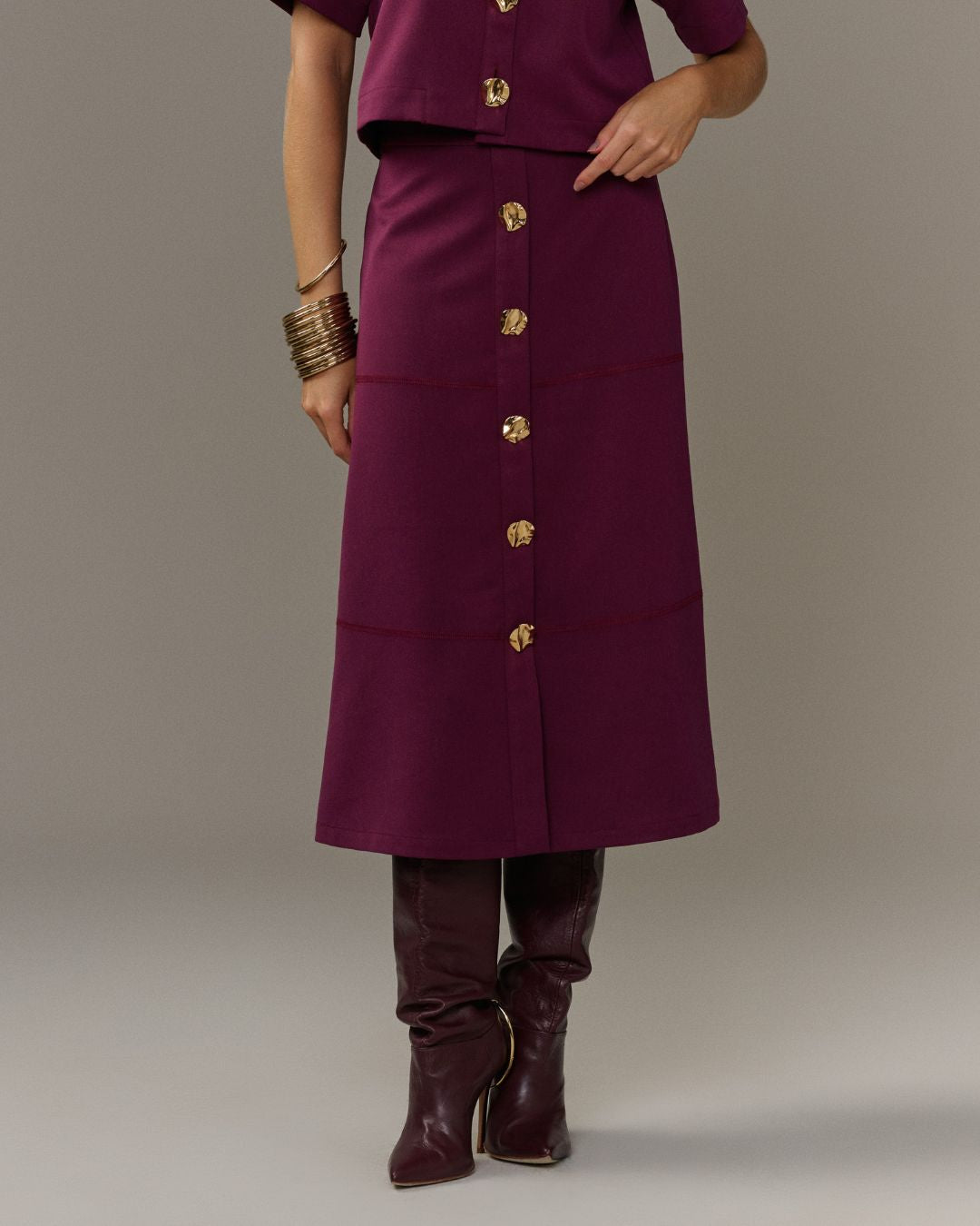 Saia midi com modelagem gode, botões frontais dourados para fechamento, prespontos aparentes delimitando recortes.