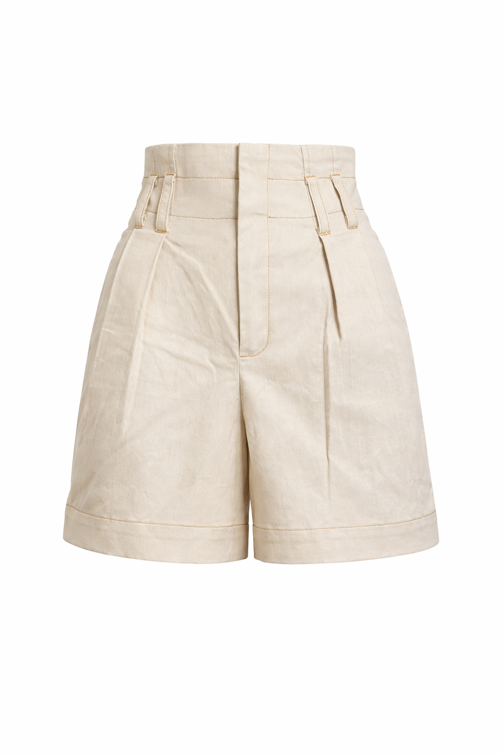 Short em brim estruturado, com modelagem de cintura alta, pregas frontais e cós com passantes. Caimento elegante que une conforto e sofisticação atemporal.