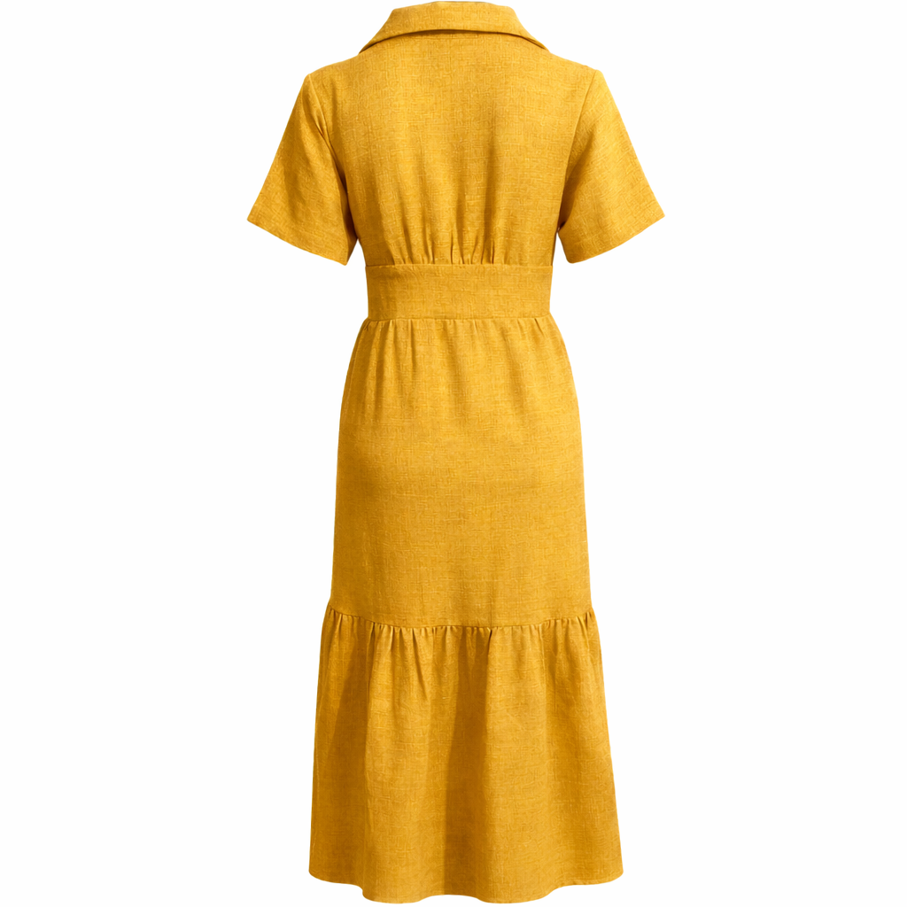 Vestido midi com modelagem acinturada, decote transpassado com gola, mangas curtas e recorte com leve franzido na barra. Elegante e feminino, com caimento leve e atemporal.