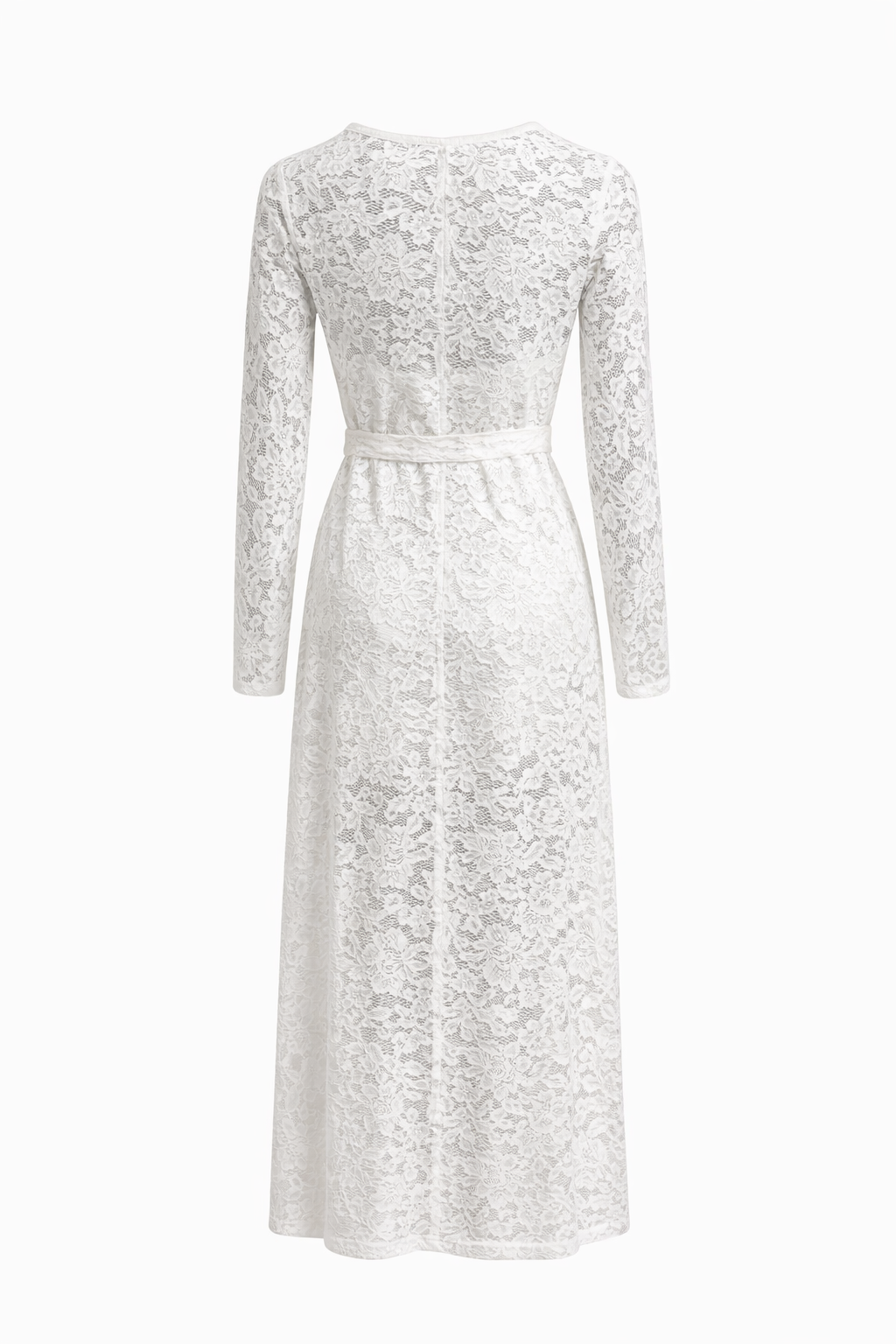 Vestido longo em renda off white, com mangas longas e caimento elegante. Sofisticação atemporal para ocasiões especiais.