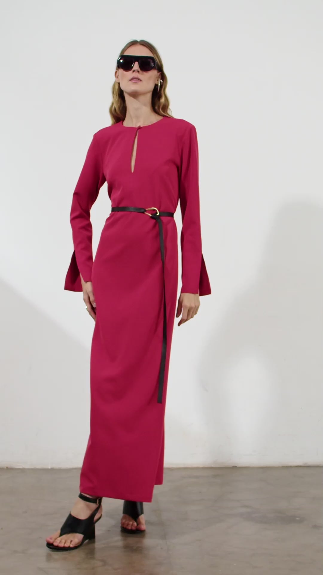 O decote discreto em abertura frontal adiciona leve sensualidade na medida certa, enquanto as mangas longas com fenda reforçam o visual contemporâneo. O cinto preto com argola metálica define a cintura e adiciona contraste chic ao tom vibrante do tecido. Um vestido feminino versátil, marcante e ideal para compor produções de impacto.